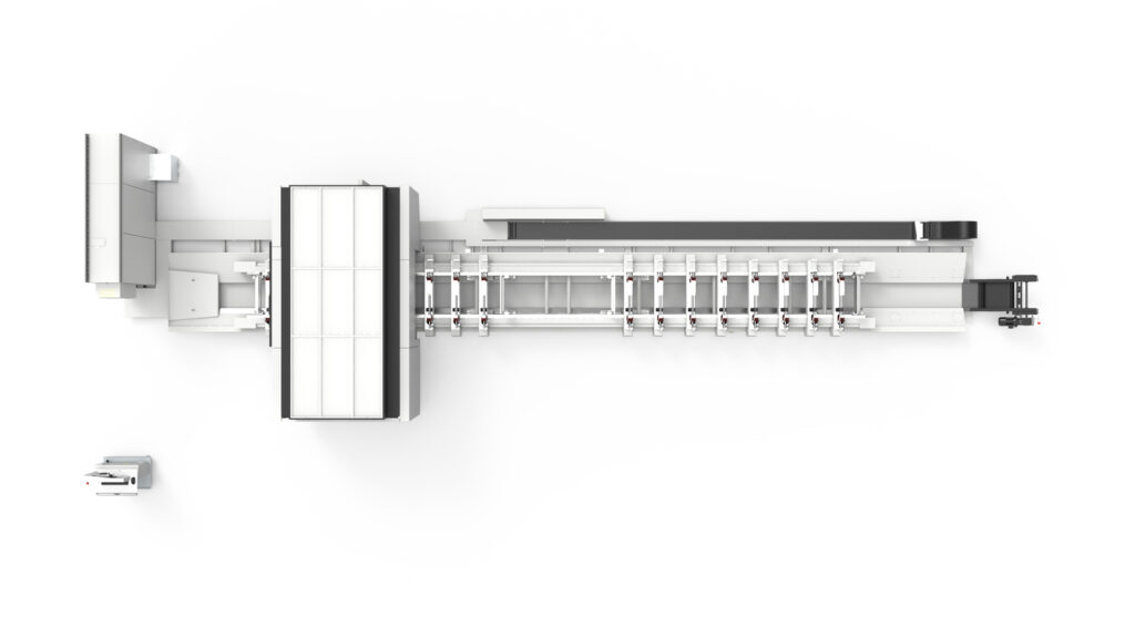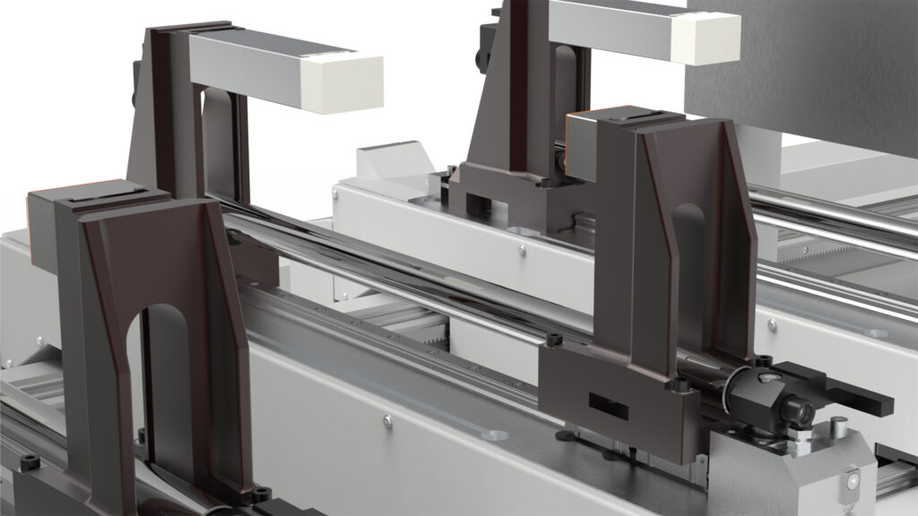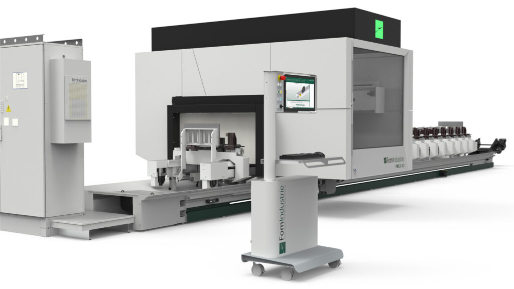 Machining centre with 5 interpolating axes for machining on 5 faces of aluminium profiles with a cross-section of 580 x 400 mm and steel tubes up to 5 mm thick. HSK E63 22 KW 24000 rpm liquid-cooled electrospindle allows the production of custom machined and milled elements. According to the configuration chosen it is possible to carry out single area, double area, pendular or multi-piece machining (up to 8 pieces with XPAL). 6 versions are available according to the length of the machine bed and whether or not cutting unit X2 is present.